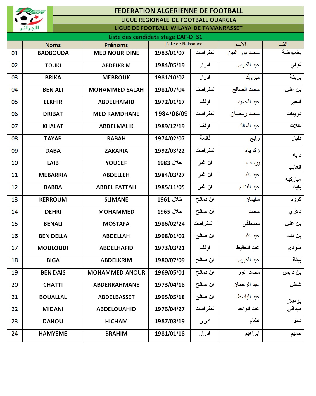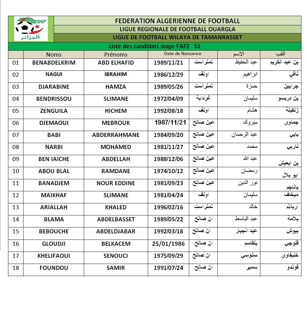 تعلن الرابطة الولائية لكرة القدم تمنراست و تحت إشراف المديرية الفنية الوطنية و المديرية الفنية الجهوية عن تنظيم التجمع الاول للمتربصين المترشحين لنيل شهادة التدريب فاف2 و كاف د و ذلك بداية شهر اكتوبر .